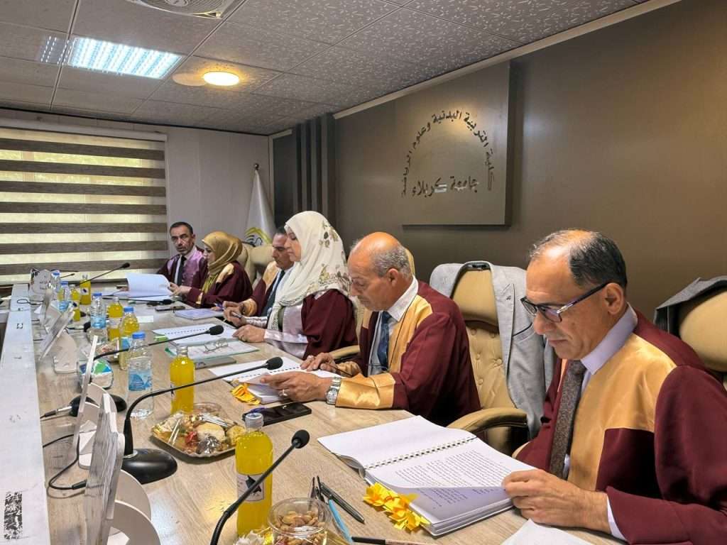 جرت مناقشة اطروحة دكتوراه في كلية التربية البدنية وعلوم الرياضة بجامعة كربلاء، للطالب عباس علي ناصر عن اطروحته الموسومة تدريبات وفق نظام( VDOT) في بعض المتغيرات الوظيفية واحتياطي السرعة وانجاز ركض 1500 متر دون 20 سنة)، وعلى قاعة المناقشات في الكلية.