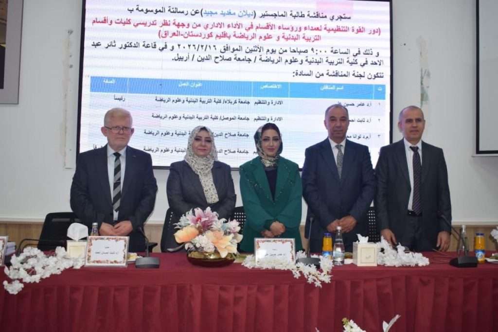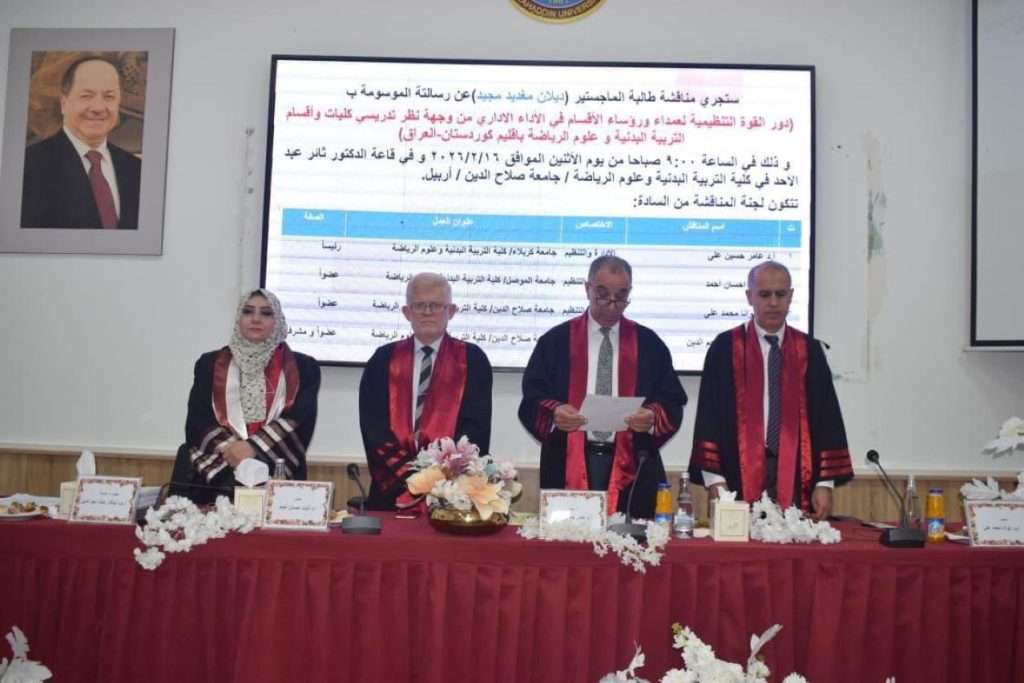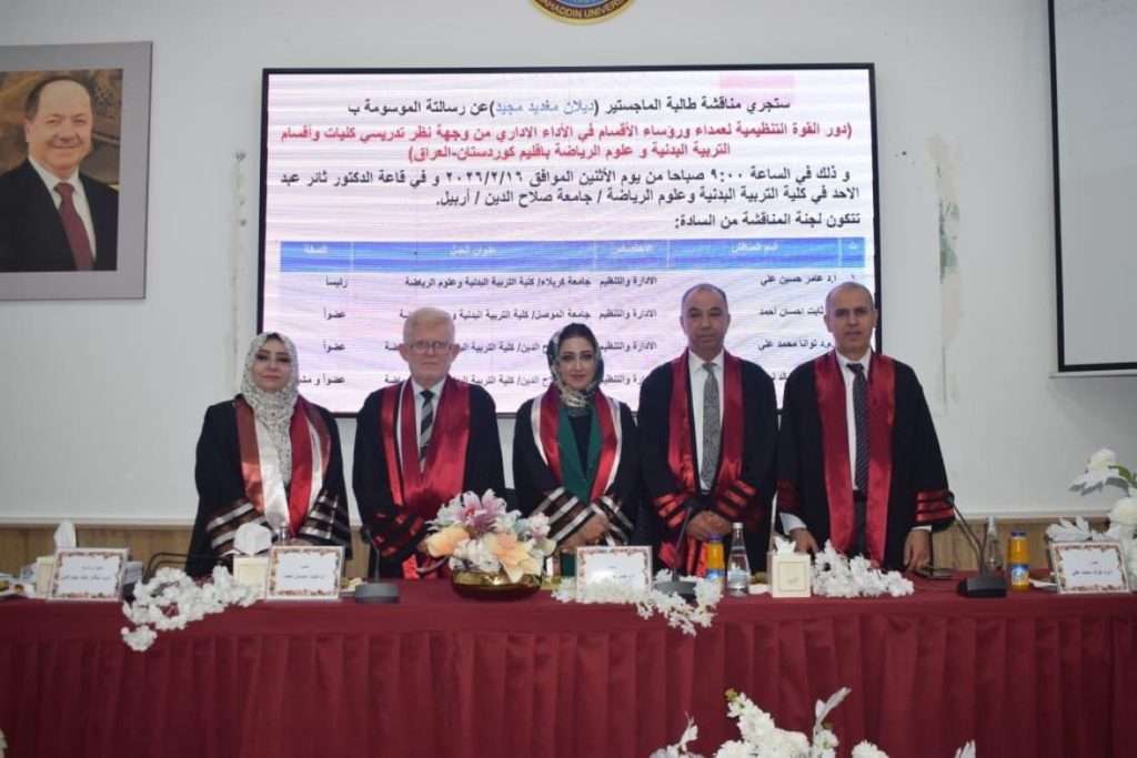 “دور القوة التنظيمية لعمداء ورؤساء الأقسام في العمل الإداري من وجهة نظر تدريسيي كليات وأقسام التربية البدنية وعلوم الرياضة في إقليم كردستان – العراق”، حيث جرت المناقشة في أجواء علمية رصينة اتسمت بالحوار الأكاديمي البنّاء، مما أسهم في إثراء موضوع الرسالة وأكد أهميته العلمية والتطبيقية في تطوير العمل الإداري بالمؤسسات التعليمية.