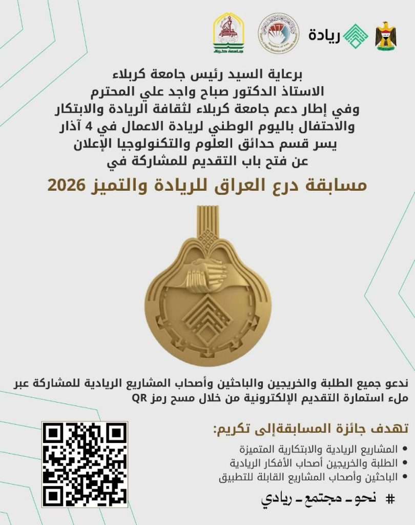 وفي اطار دعم جامعة كربلاء لثقافة الريادة والابتكار والاحتفال باليوم الوطني لريادة الاعمال في 4 اذار يسر قسم حدائق العلوم والتكنولوجيا الاعلان عن فتح باب التقديم والمشاركة في مسابقة درع العراق للريادة والتميز 2026